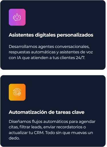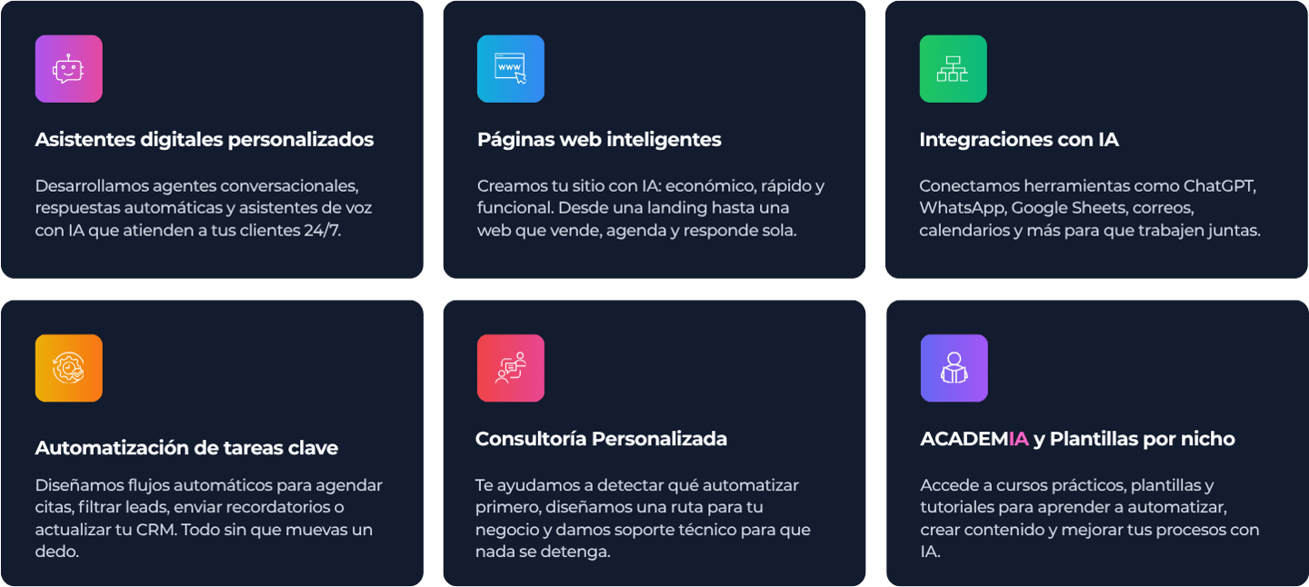 Ofrecemos soluciones que agilizan procesos, reducen errores y ahorran tiempo. Páginas web IA, automatizaciones eficientes y Academia práctica para que tu negocio evolucione sin depender de programadores.